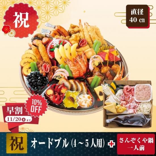 海老芝煮、数の子、筑前煮、ソフトサラミ、ふきの煮物、京なます、たこ玉子、ぶり照焼、舞姫、
